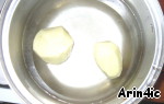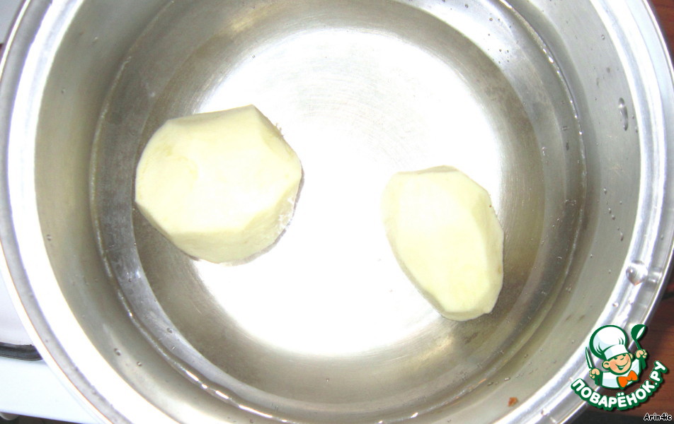 Начнем с приготовления овощного отвара. В рецепте указывается 1, 5 литра воды, мне этого показалось маловато, суп получился слишком густым, лучше взять 2 литра воды. Воду подсолить и отварить в ней 2-3 шт. очищенной картошки.