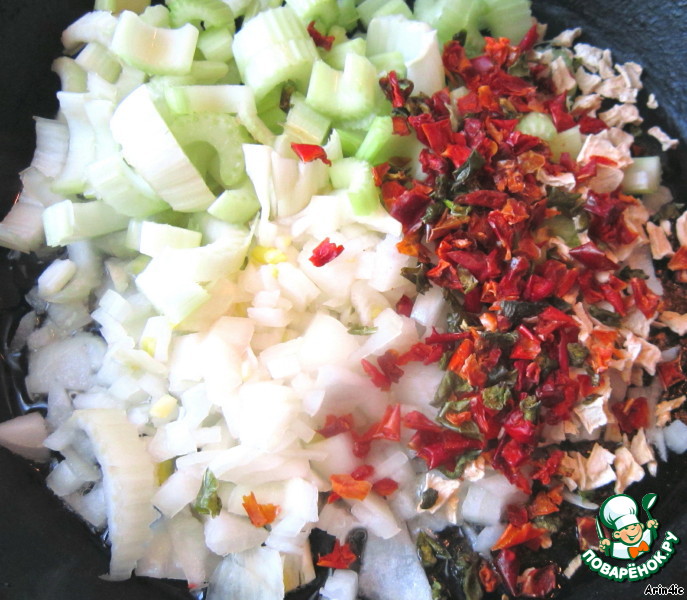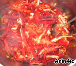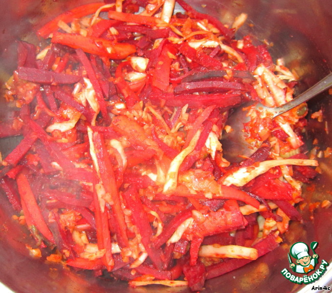 Почистить и нашинковать соломкой свеклу и морковь. Сбрызнуть уксусом. Обжарить на растительном масле, помешивая, до испарения влаги, добавить томатную пасту и жарить до готовности овощей. На другой сковородке обжарить нарезанную кубиками луковицу, добавить сельдерей и корень петрушки. Затем добавить перец болгарский, нарезанный кубиками (у меня был только сушеный перец).