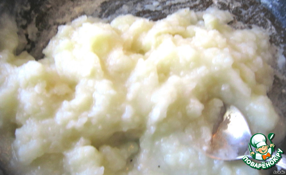 Отварную картошку превращаем в пюре, на сухой сковороде обжариваем муку до появления "орехового" запаха. Добавляем картофельного пюре, постепенно вливаем половину картофельного отвара и тушим заправку пару минут до загустения, все время помешивая.