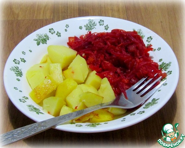 На небольшом количестве растительного масла обжариваем лук примерно 5 минут. Затем добавляем свеклу и морковь, обжариваем еще 10 минут.