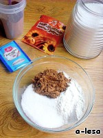 Муку просеять с разрыхлителем, добавить какао, сахар, ванильный сахар и тщательно перемешать.