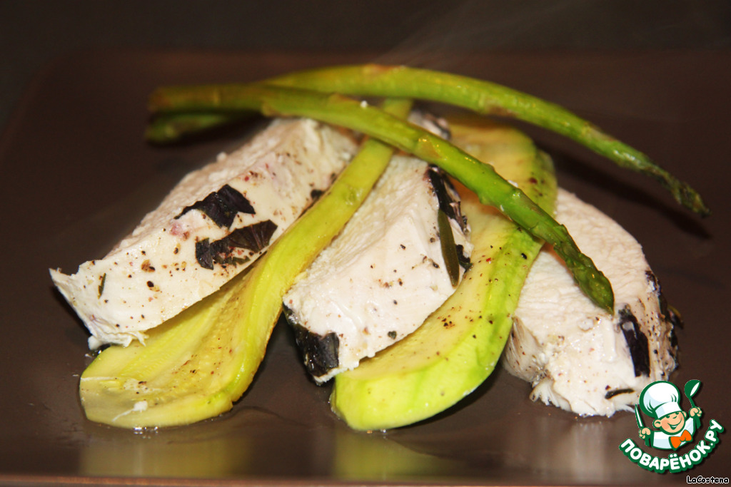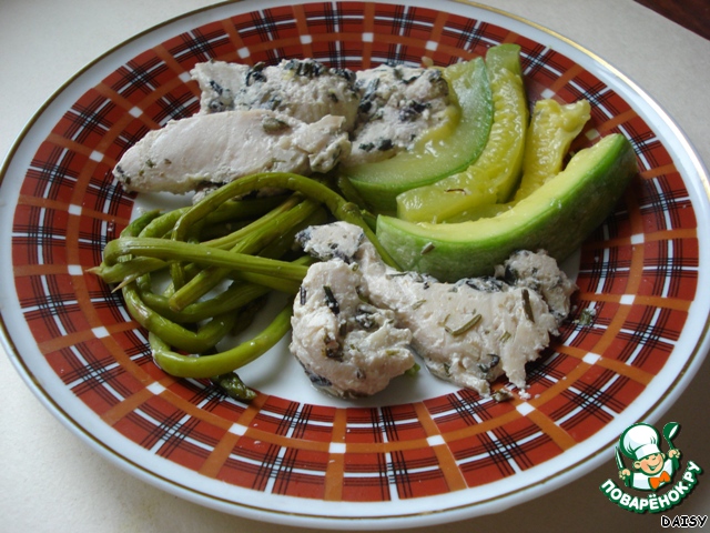 Нежнейшее куриное филе с травами, спаржей и цукини.