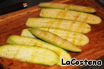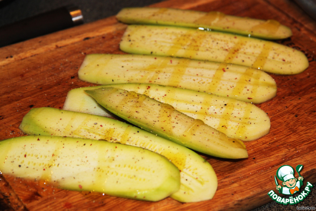 Цукини нарезать дольками, посолить, поперчить и сбрызнуть оливковым маслом.