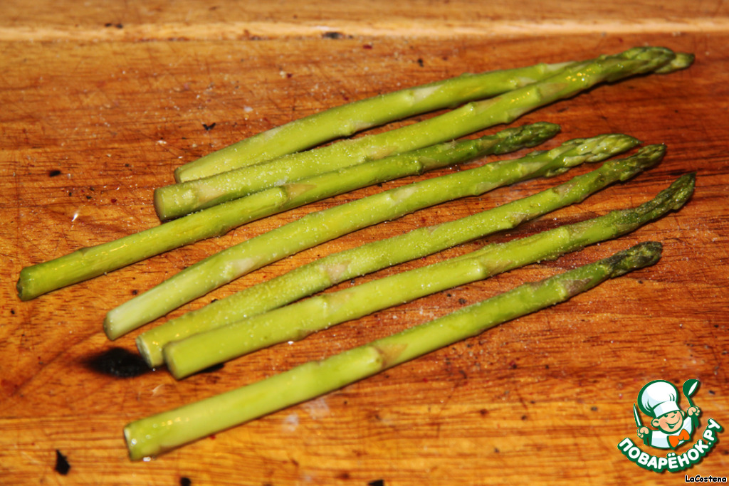 Готовое филе нарезать ломтиками, соединить с цукини и спаржей и подавать к столу.