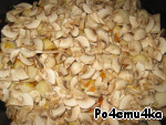 Пельмени выкладываем в форму, смешиваем с зажаркой, сверху выкладываем грибы.