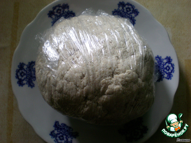 В кефирно-творожную смесь постепенно добавить муку и хорошо смешать. Тесто получается чуть липкое, но не советую забивать его мукой. Тесто скатать в шар, завернуть в пленку и поставить в холодильник на 15-20 минут.