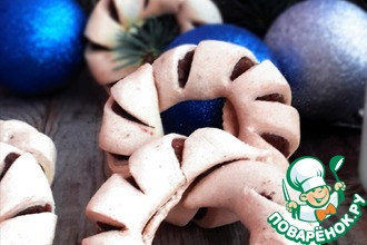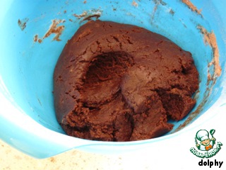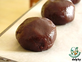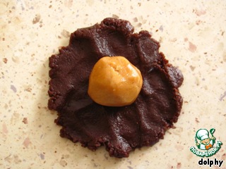 Шоколадное тесто также разделите на 24 части. Из каждой части сформуйте лепешечку, на которую выложите шарик начинки.