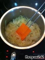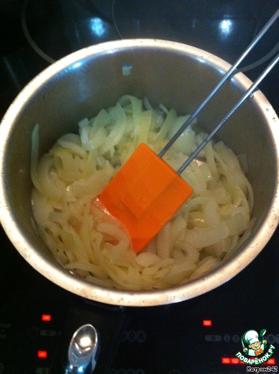 Режем лук полукольцами. Разогреваем в казанке оливковое масло, кидаем лук и обжариваем на среднем огне, помешивая, минут 5. Главное - чтобы не пригорел, это даст горечь.