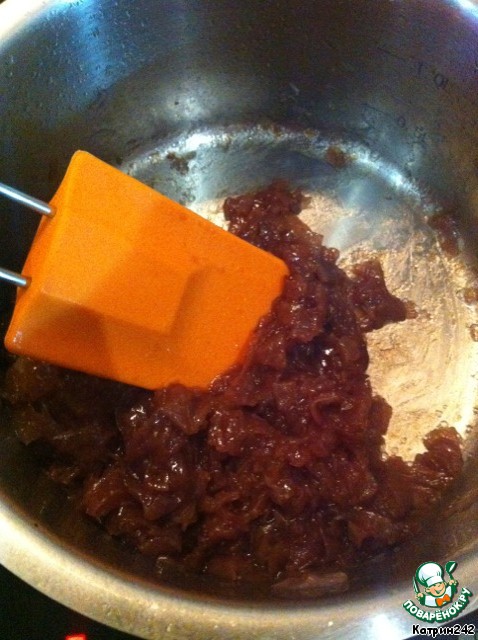 Затем добавляем вино, уксус, сахар, соль, перец, уменьшаем огонь, накрываем крышкой и, время от времени помешивая, оставляем тушиться. Уйдет времени примерно час, а может быть, и больше! Нам надо добиться, чтобы лук стал «липким».