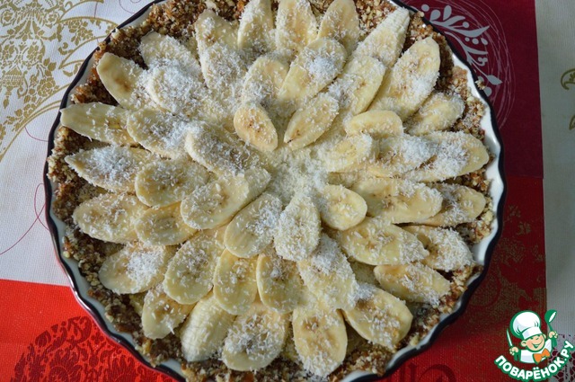 Бананы нарежьте ломтиками по диагонали и выложите на пирог. Чтобы они не потемнели, можно сбрызнуть их лимонный соком.