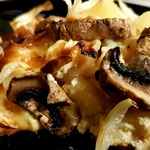 Теперь займeмся грибами (кстати о них, я думаю использовать не то что можно, а даже нужно любые другие, более ароматные грибы. Просто у нас, кроме шампиньонов и вeшенок сложно что-то найти, а с сушeными я не пробовала). Грибы мы просто выкладываем поверх картошки, посыпаем луком и заливаем жидкостью от грибов (жидкости должно быть достаточно, но не очень много, она должна покрывать картофель не полностью). Ставим в духовку, разогретую до 180 градусов и доводим до полной готовности. При подаче посыпаем обильно зеленью! Приятного аппетита!