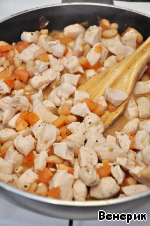 Филе куриной грудки нарезать кубиками, и обжарить на растительном масле (3-4 ст. л.). Обжариваем очень быстро, буквально 3-4 минуты, для того, чтобы мясо не пересушилось и оставалось сочным. Мясо посолить, поперчить, добавить щепотку зиры, растертую пальцами.
