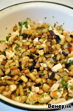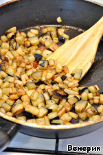 Дальше, чашку убираем на время в сторонку. В сковороде нагреть растительное масло (4-5 ст. л.), и быстро (!) на сильном огне обжарить баклажаны (нарезанные кубиками). Обжариваем до корочки, чтобы не успел выйти сок из баклажанов, и остался внутри, иначе получится каша. Обжаренные баклажаны в сковороде посолить, поперчить по вкусу.