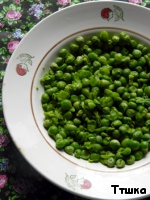 Зеленый горошек бланшировать в кипящей воде. Откинуть на дуршлаг и немного размять с помощью вилки.