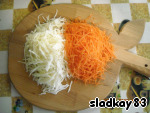 Пока опара бродит, делаем начинку. Капусту мелко нашинковать, морковь натереть на крупной терке (я терла на терке для мелкой корейской моркови).