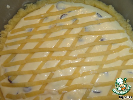 Взять круглую форму для выпечки диаметром примерно 22 см, раскатать тесто в виде круга немного большего диаметра. Если честно, у меня тесто получилось белее рассыпчатым, я его не раскатывала, а просто руками застелила дно и стенки формы тестом.