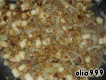 На сковороде растопим сливочное масло, выкладываем лук, нарезанный полукольцами, и истолченный чеснок. Тушим 3-5 минут, затем добавляем порезанные кубиками яблоко и финики. Выкладываем чечевицу, приправляем молотым кориандром, солью, перцем и готовим 10 минут. -