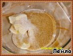 Растереть масло (размягченного, комнатной температуры) с сахаром (количество зависит от степени вашей персональной сладкоежкости) до однородности.