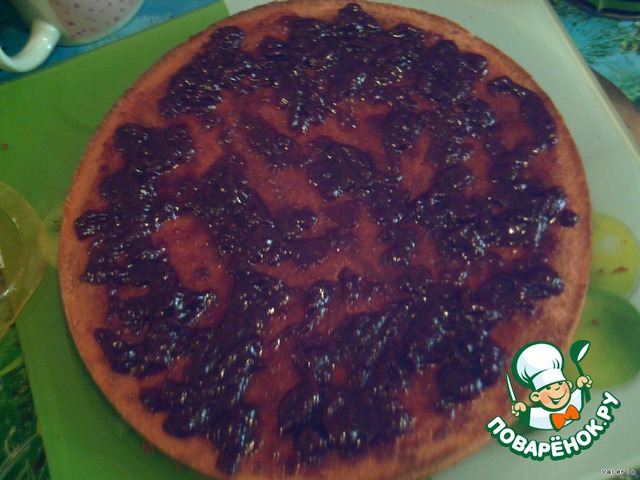 Взять второй корж, положить на первый, чуть прижать, пропитать и выложить варенье.