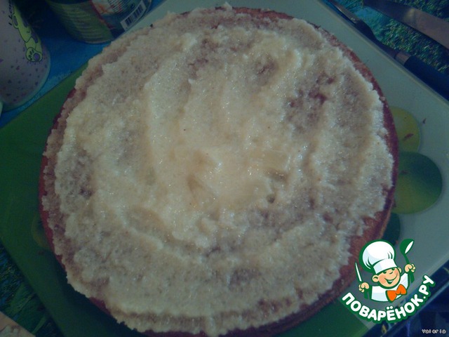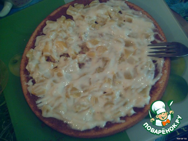 Взять следующий корж, положить, прижать, пропитать, измельчить ананасы (так потом лучше резать торт).