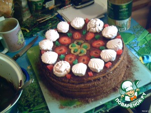Залить глазурью последний корж, и пока горячая начать украшать. У меня был зефир, цукаты и клубничка - все пошло в ход. С зефиром, правда проблемка была, кто-то съел и мне не хватило 2-х штучек, пришлось вырезать и из обрезков мудрить недостающие.