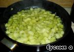 Параллельно я начала делать начинку: в др. сковороде растопила сливочное масло (на среднем огне) и затем высыпала туда сахар. Теперь нужно постоянно помешивать. Как только сахар станет карамельного цвета, сразу добавляем фрукты и уменьшаем чуть огонь. Готовим, пока они не станут мягкими, и снимаем с плиты.