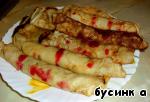 Ну теперь заключительная и самая приятная часть. Берём блинчик, кладём на край начинку и сворачиваем (я решила в трубочку). Некоторые я просто сложила вчетверо (порванные) и полила сиропом (от начинки). Получилось тоже очень вкусно!!!