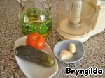 В измельчитель положить огурчик, помидорчик без кожи, хрен и чеснок. Добавить клюквы 2 ст.л. и оливковое масло, измельчить,
