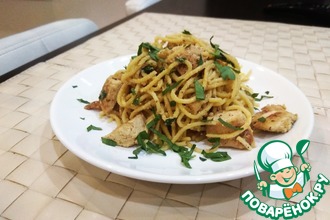 Смешать в одной ёмкости макароны, соус, рыбу и яблоко. Если нужно, дозаправить по вкусу.