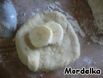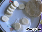 "Отрываем" от теста небольшой кусочек-шарик, делаем из него лепёшку (руками или скалкой). Банан обваливаем в сахаре.