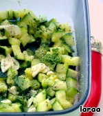 Займемся цуккини. Нарезать их на кубики или произвольной формой. Разогреть растительное масло и слегка пассеровать минут 5. Также переложить в контейнер. Чеснок и зелень нарезать, добавить к цуккини. Выжать туда лимонный сок, посолить и поперчить по вкусу. Перемешать и тоже оставить настояться 2 часа.
