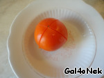 Тем временем помидор ошпариваем кипятком, надрезаем шкурку крестом