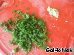 Чеснок пропускаем через пресс или рубим и перетираем с солью ножом, петрушку мелко рубим.