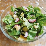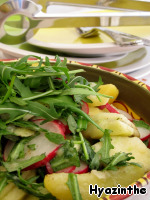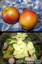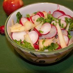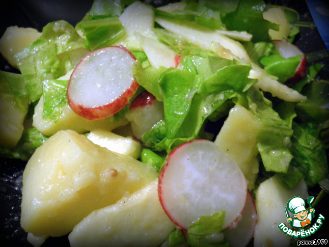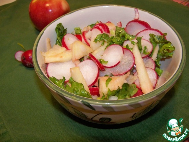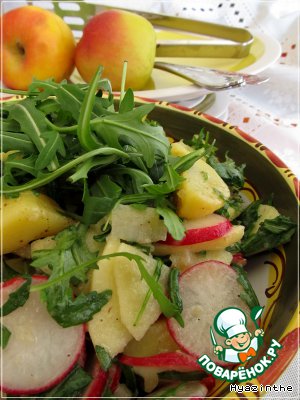 Не очень обычное сочетание продуктов, но вкус нас не разочаровал - салат быстро "ушел" со стола. Свежесть яблок, острота редиски и салатной заправки, сытость картофеля - этот салат можно подавать вместо гарнира.