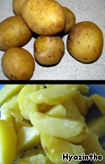 Картофель варим "в мундире" в соленой воде, слегка остужаем, очищаем от шкурки и нарезаем вдоль на 4-6 частей.