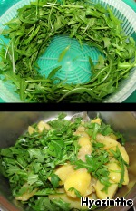 Рукколу моем, обсушиваем, нарезаем, добавляем в остывший картофель.