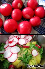 Чистую редиску нарезаем тонкими кружочками, добавляем в салат.