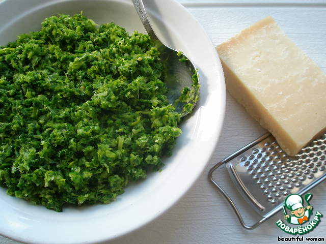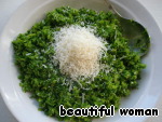 Пармезан натереть на тёрке и добавить к зелени с орехами.