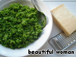 Традиционно песто растирают в ступке. Да простят меня итальянцы, но мы приготовим этот соус, пропустив листья черемши и кедровые орехи через мясорубку с мелкой решёткой.