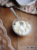 Смешать рикотту (или творог) и сахарную пудру, но пробовать на свой вкус.