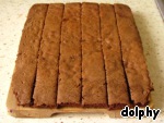 С остывшего бисквита снимите бумагу. Прямоугольный бисквит нарежьте полосками. -