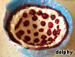 Выложите эту массу в купол, распределяя ее по коржам, а середину оставляя свободной. "Нашпигуйте" начинку половиной вишни.