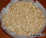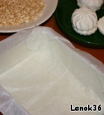 1.Сначала приготовим форму для наших конфет, потому, что потом у вас на это не будет времени. По рецепту форму нужно смазать маслом сливочным, но я не рискнула этого делать, я постелила в форму пергаментную бумагу. Высыпаем туда наш воздушный рис.