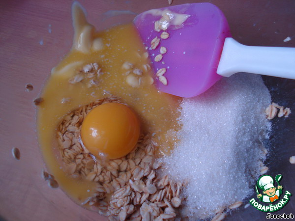 В хлопья добавить растопленное масло, яйцо, сахар и размешать.