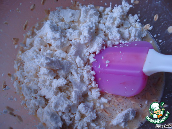 Потом добавляем творог и размешиваем.