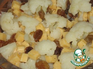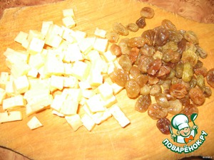 Сыр нарезаем мелкими кубиками, изюм распариваем.
