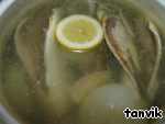 2. Положить в кипящую на слабом огне воду, добавить соль, уксус, ломтик лимона и укроп, а также разрезанную пополам луковицу.