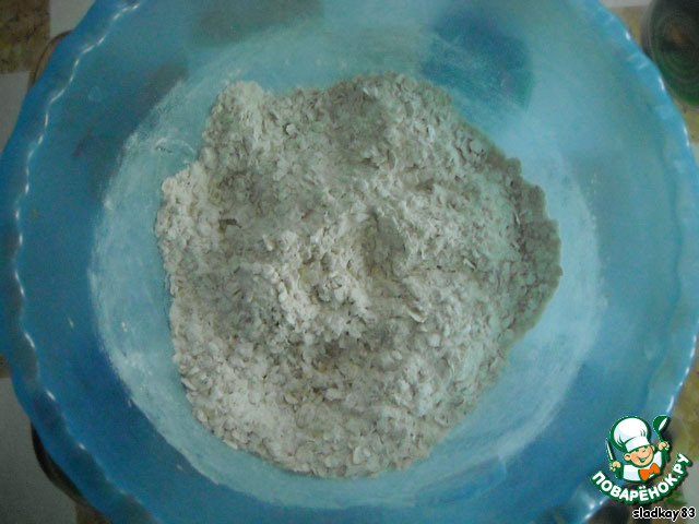 Смешать в миске муку, горчицу, овсяные хлопья, соль, перец.