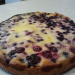 Достаем основу из духовки, выкладываем на тесто вишню (клубнику, малину, чернику или др. я не размораживаю, а сразу выкладываю на основу) и заливаем заливкой.