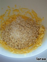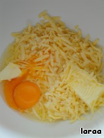 Масло, сыр и яйца перемешать. Добавить шепотку соли и сахар.